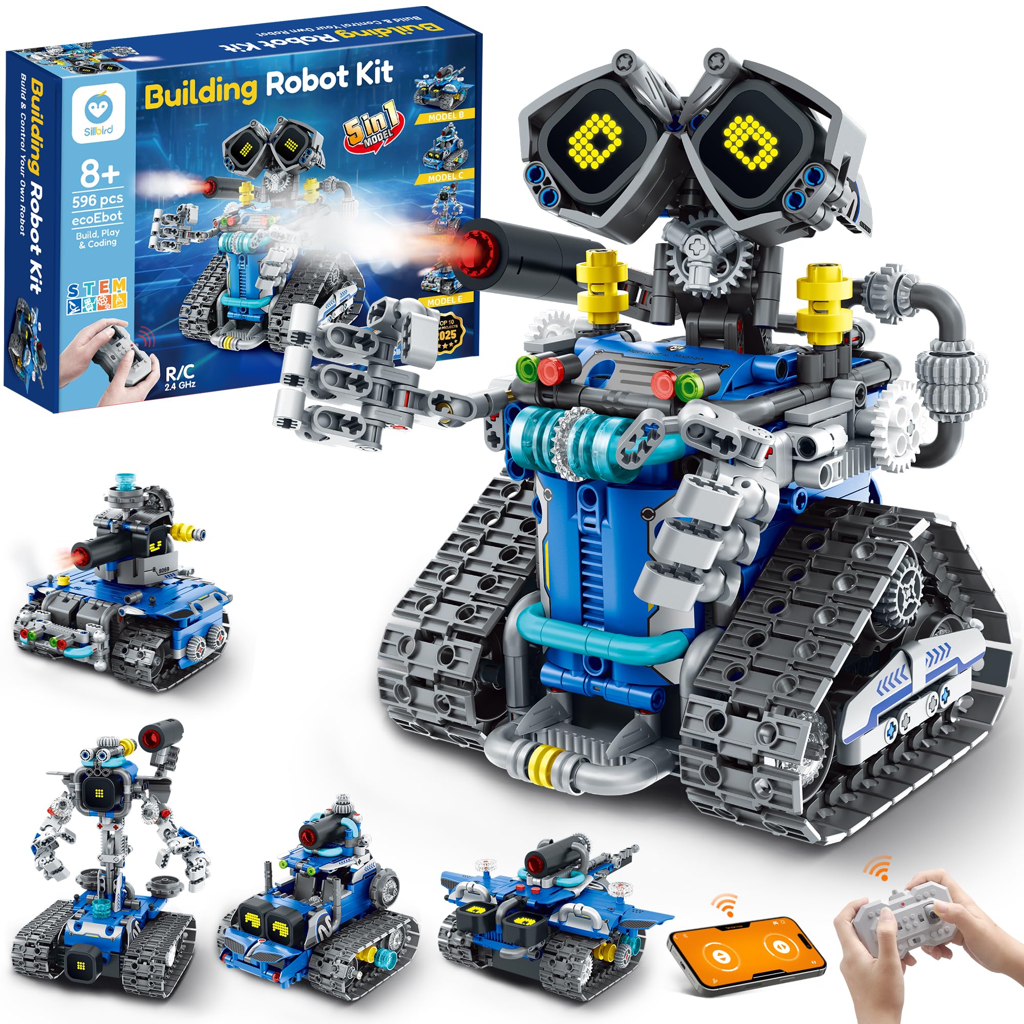 Sillbird STEM Robot Building Toys for Kids Ages 8-13, 5in1 Remote & App Controlled Technic Robot Building Kit with LED, Music Spray, Rechargeable Creative Robotics Gift for Boys 8 9 10 11 12+, 596pcs