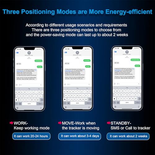 1. WORK-Behalten Sie den Arbeitsmodus bei, es kann 20-23 Stunden arbeiten. (Le tracker continue de fonctionner et envoie des données par intervalles de temps, et vous verrez le tracker en ligne dans l'application) Commande de réglage : WORK00002. Mouvement : lorsque le tracker se déplace, il peut fonctionner pendant 3 à 4 jours. (Le réglage d'usine est le mode « MOVE ») (le tracker ne fonctionne que lorsqu'il bouge, il apparaît en ligne dans l'application. Mais quand il est arrêté, il se met en veille, le GPS est désactivé, le GSM fonctionne en mode faible consommation, il s'affiche hors ligne dans l'application. Vibration, commande SMS, appel Tracker peut réveiller le tracker pour travailler pendant 5 minutes et afficher 5 minutes en ligne dans l'application, puis hors ligne.) Commande de réglage : MOVE00003 STANDBY-SMS ou appel au tracker, il fonctionne 5 minutes, il peut être 7-14 jours en mode veille. (Mode veille, GPS désactivé, GSM fonctionne à faible consommation. SMS, appels peuvent réveiller le tracker pour fonctionner pendant 5 minutes. et 5 minutes en ligne dans l'application, puis hors ligne. Commande de réglage : STANDBY0000. Veuillez noter : la durée de la consommation d'énergie de l'appareil dépend du mode de travail que vous réglez, seul le mode STANDBY est le plus économe en énergie et peut être utilisé longtemps, et le mode de travail mobile peut économiser de l'énergie lorsque la voiture s'arrête, dès que la voiture est en mouvement, l'appareil sera dans un état de fonctionnement en marche, et la consommation d'énergie correspond à la consommation d'énergie du mode Keep-Working.