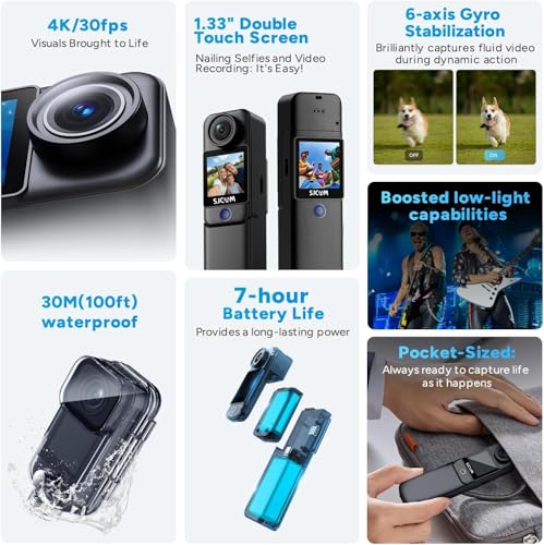 【4K Action Camera 7H Extended Battery Life】: The C300 action cam VIDEO FILMING CAMERA adopts a dual-battery design, enjoy uninterrupted recording with the C300 action camera's impressive long battery life, and can be used continuously for up to 420 minutes after a full charge. Capture all your adventures without worrying about running out of battery. with Stabilization, pocket camera