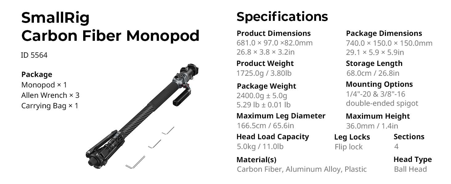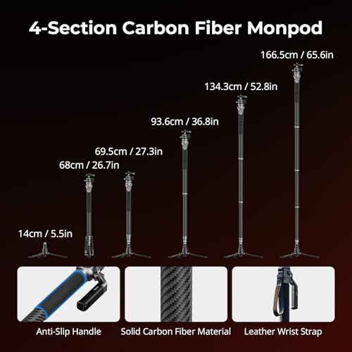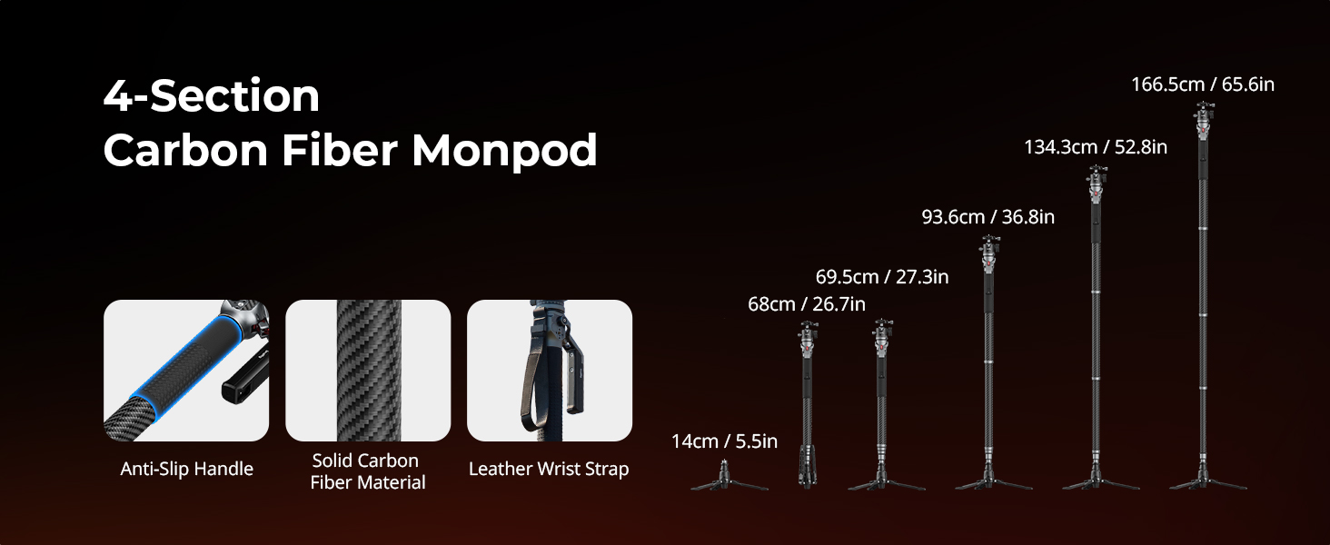 - 4-Section Carbon Fiber Monopod Leg – Provides greater extended height of 166.5cm / 65.6in to accommodates diverse shooting perspectives, and more compact storage (68cm / 26.8") than other monopods