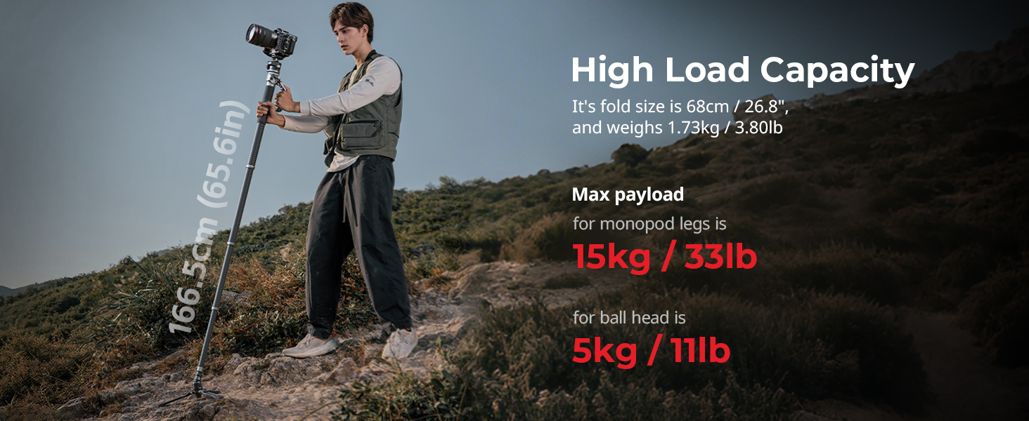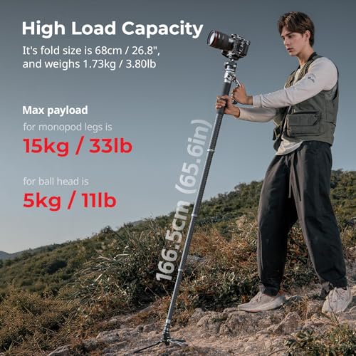 - Max. Load Capacity – This monopod is made of carbon fiber, aluminum alloy, ensures superior durability and stability, while the premium carbon fiber legs provide long-lasting performance, supporting loads of up to 15kg / 33lb for the legs and 5kg / 11lb for the head. A built-in bubble level provides precise leveling in all shooting scenarios