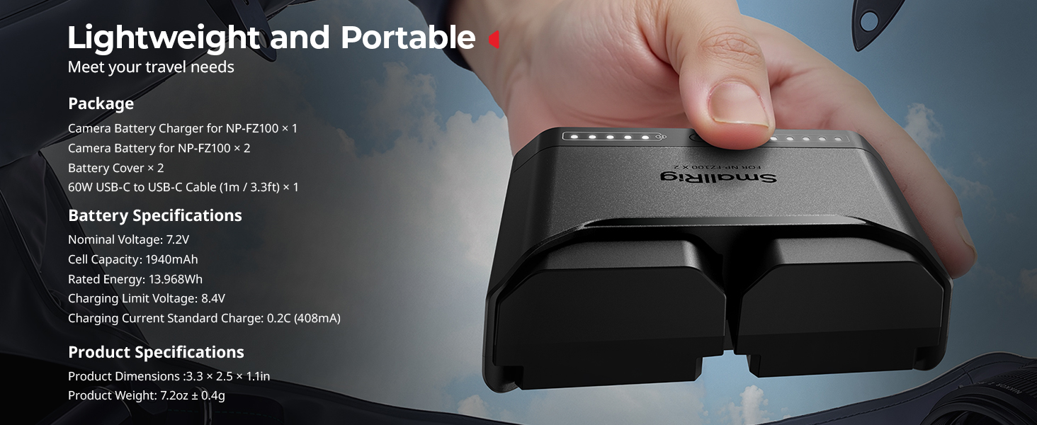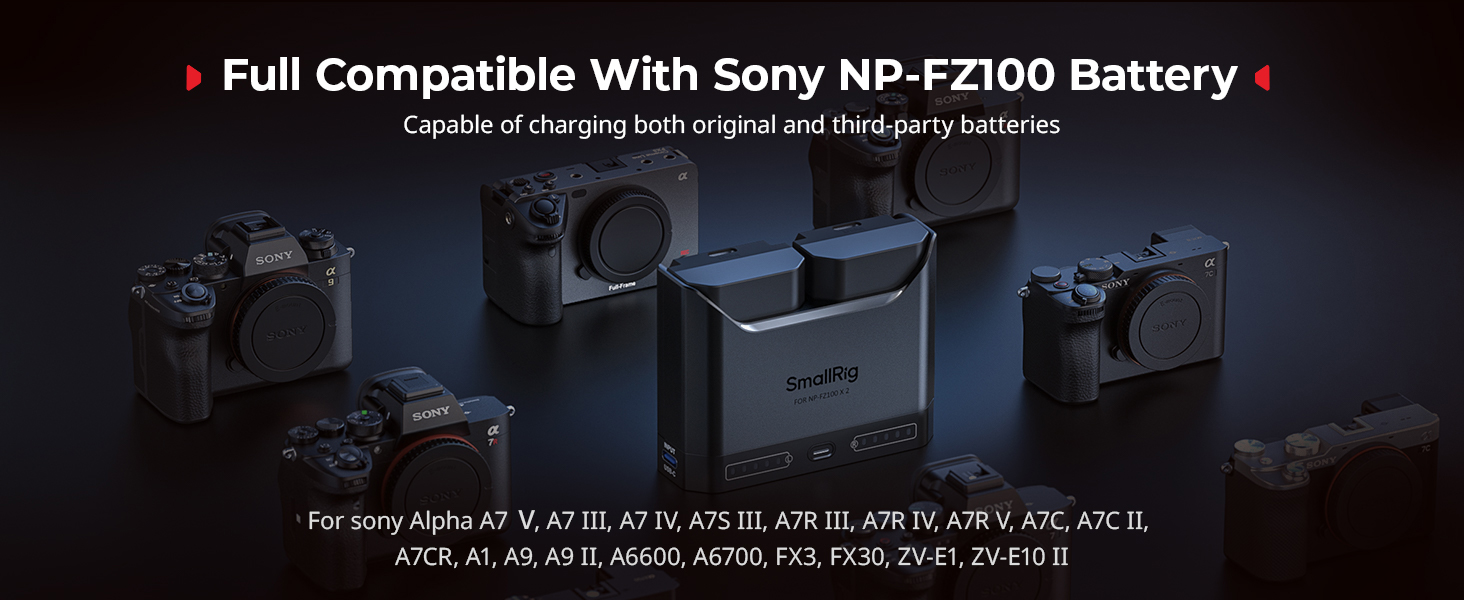 - Full Compatibility for NP-FZ100:Smallrig camera battery charger is fully compatible with Sony NP-FZ100 batteries, ensuring reliable charging for both original and third-party batteries.It perfectly supports power needs for sony Alpha A7 III, A7 IV, A7S III, A7R III, A7R IV, A7R V, A7C, A7C II, A7CR, A1, A9, A9 II, A6600, A6700, FX3, FX30, ZV-E1, ZV-E10 II,etc.