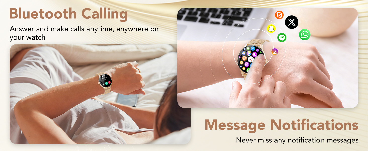 - 【Bluetooth Calling & AI Voice】Answer or make calls via Bluetooth after connecting your smartwatch for women to your phone. The clear microphone and high-fidelity speaker provide excellent call quality. The smart watch for women also supports AI voice assistant, allowing you to use any functions of your phone’s AI assistant.