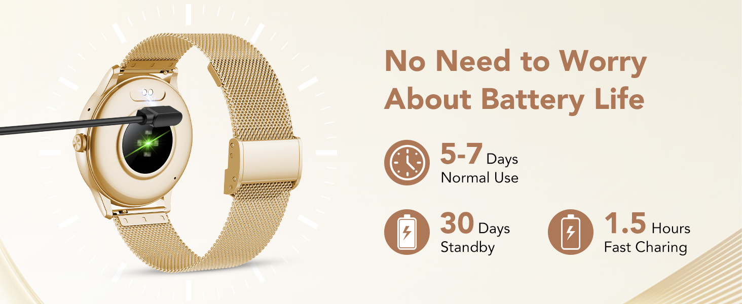 - 【7-Day Long Battery Life】The smart watch for women is equipped with a high-capacity 350mAh battery. It provides up to 7 days of daily use and can be fully charged in just 2.5 hours, so you never have to worry about running out of power.