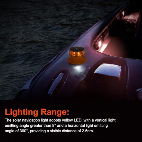 - Lighting Range: The solar navigation light adopts yellow LED, with a vertical light emitting angle greater than 8° and a horizontal light emitting angle of 360°, providing a visible distance of 2.5nm.