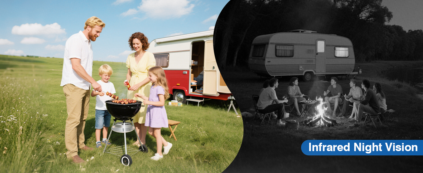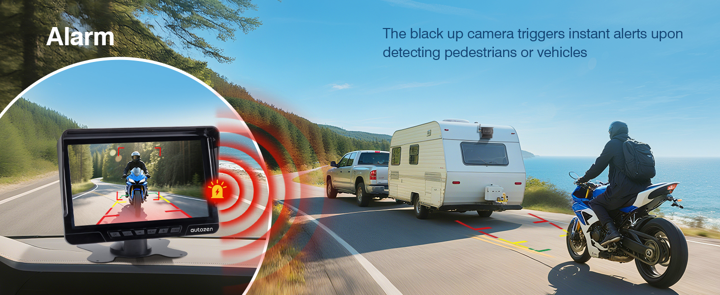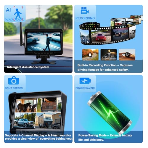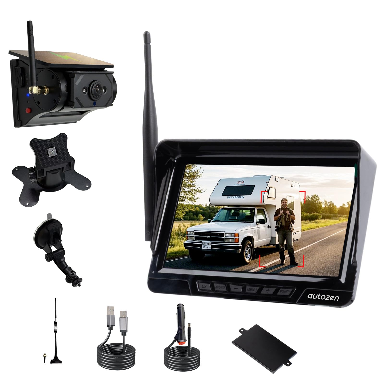 - AI Detection Alarm & Powerful Digital Signal: This reversing camera for car can identify people and cars, and will immediately sound an alarm when detected; built-in digital signal receiver and frequency hopping technology, and has 2.4GHz WiFi transmission speed, strong anti-interference ability. The signal transmission distance of the solar backup camera can reach 60 feet, suitable for cars, Motorhome, Camper, Trailer, Van, etc.