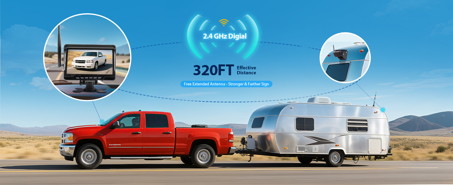 - Stable Signal Transmission: This aotozen wireless reversing camera features a built-in digital signal receiver and frequency hopping technology, boasting 2.4GHz WiFi transmission speeds and strong anti-interference capabilities. An additional extension antenna extends the signal transmission range, reaching up to 320 feet in open areas. Note: When installing, do not point the wireless reversing camera and monitor antennas toward the ground or metal (metal will block the signal).