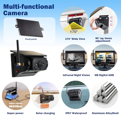 Solar Wireless Reversing Camera for Car, Alarm Function, 7”1080P Screen, Night Vision, Stable Signal, DVR Recording, IP68 Waterproof, 1-Min Install, Reverse Camera Kit for Motorhome, Trailer, Va