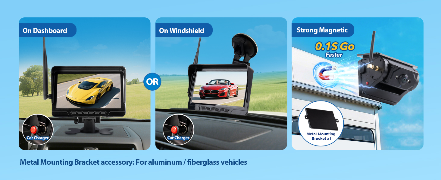 - Easy & Quick Installation:The wireless reversing camera adopts magnetic design, no professional installation is required, it is easy to use . The reversing camera for car has 6 built-in strong magnets with strong adsorption force, no need to worry about falling off; the base of the reversing camera is covered with a soft TPU layer to effectively prevent scratches on the car paint.