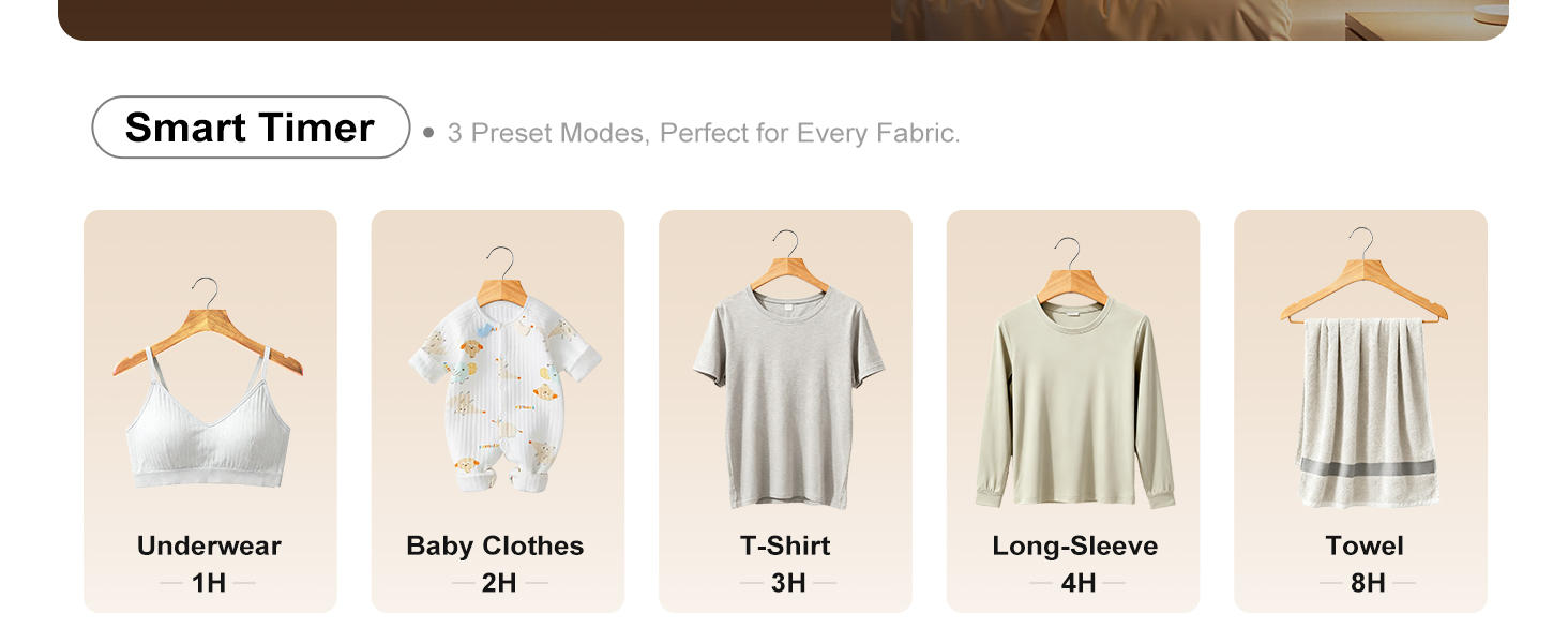 Smart Timer Settings (4H / 8H / 12H) – Choose from three preset drying durations to match your needs — short sessions for delicates or longer cycles for thicker fabrics.