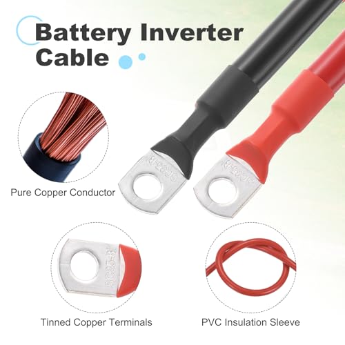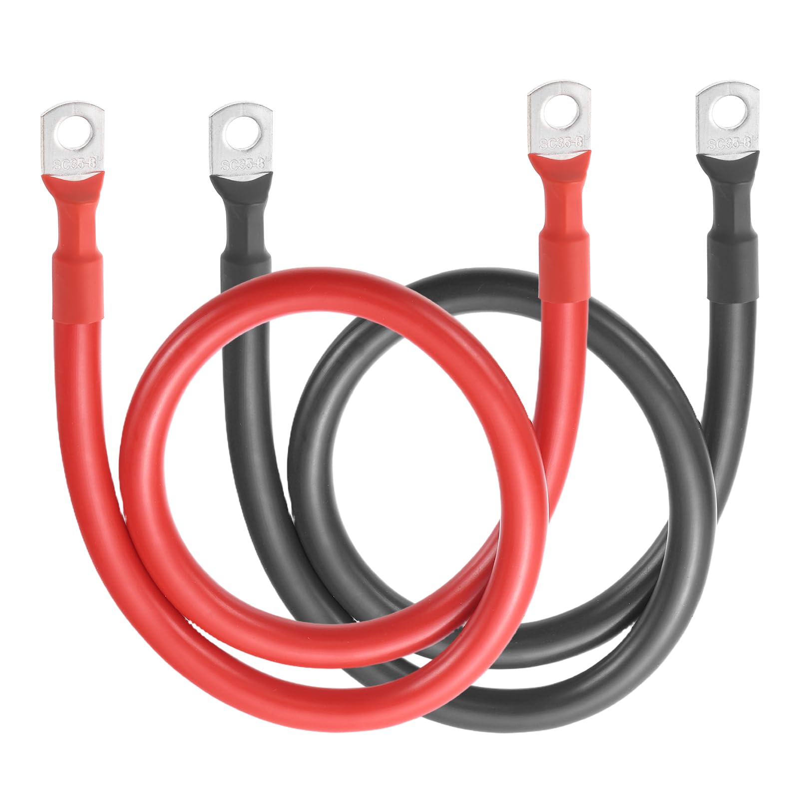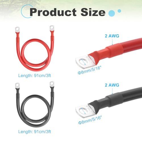 - Battery Cables with Terminals; Length: 91cm/3ft; Conductor Material: Pure Copper; Conductor Wire Gauge: 2 AWG; Terminal Type: SC Terminals; Terminal Inner Diameter: 8mm(5/16 Inch); Terminal Material: Tinned Copper; Insulation Material: PVC; Color: Red, Black; In the Package: 2 x Battery Cable(Red+Black)
