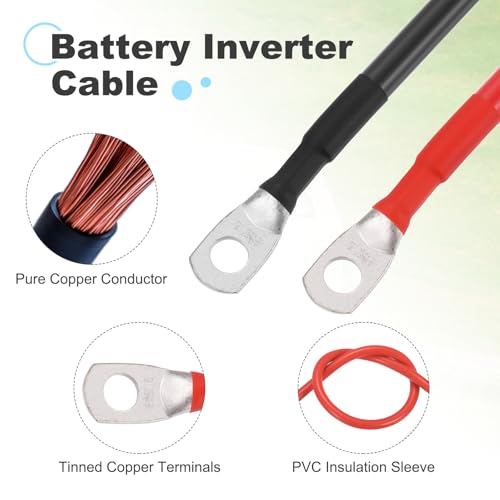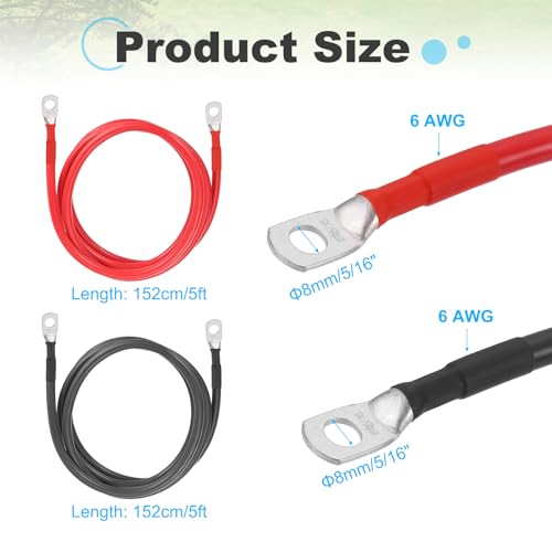 - Battery Cables with Terminals; Length: 152cm/5ft; Conductor Material: Pure Copper; Conductor Wire Gauge: 6AWG; Terminal Type: US standard O-ring; Terminal Inner Diameter: 8mm(5/16 Inch); Terminal Material: Tinned Copper; Insulation Material: PVC; Color: Red, Black; In the Package: 2 x Battery Cable(Red+Black)