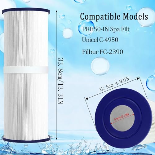 Filter cartridge for PRB50-IN:Spa Filter Length:13 5/16”(33.8cm),Outside Diameter: 5”(12.5cm), Top Hole:2 1/8”(5.4cm) , Bottom Hole:2 1/8”(5.4cm),Filtration Area:50 sq. ft. Compatible with PRB50-IN, Unicel C-4950, Filbur FC-2390, Darlly SC706, Pentair R173434.Note: All manufacturer names and part numbers remain the property of the respective holders and are used for compatibility information only. TIDGRD is an independent brand.