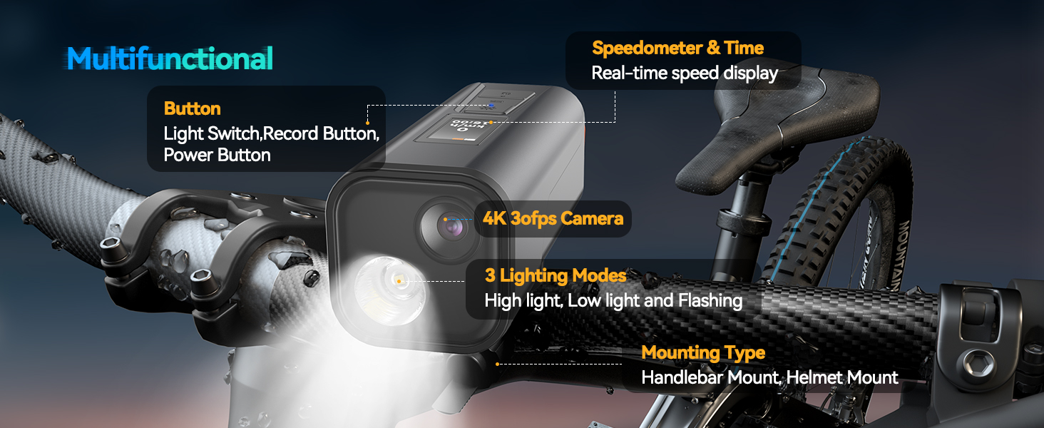 - 【5-in-1 Cycling & Commuting Companion】Combines a 4K action camera, GPS bike computer, speedometer, safety headlight, and incident recorder into one device—reducing handlebar clutter while providing all essential riding and commuting data. Also works perfectly as a Recorder Cycling Camera for daily biking or motorcycle use.