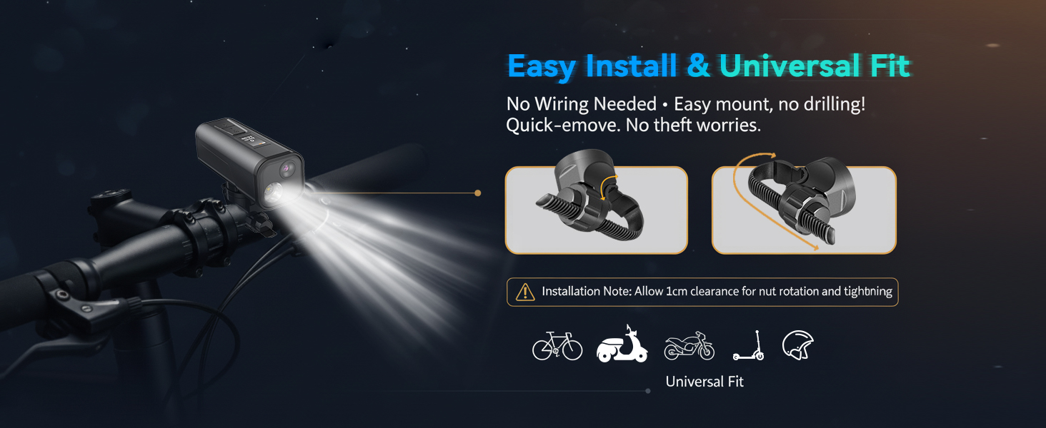 - 【IP65 Waterproof & Quick Tool-Free Installation】With IP65 waterproof protection, it supports riding in the rain (not submersible). No tools or wiring required—mount this Handlebar Bike Cameras system to any road bike, MTB, or folding bike in seconds. Also suitable for motorcycles and helmets as a compact Motorcycle Camera option. Fits handlebar circumference ≤14cm; strap length 15cm (with 1cm reserved for tightening).