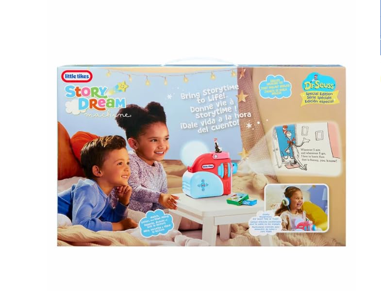 Transform bedtime into a magical adventure with the Story Dream Machine, an interactive story projector that brings tales to life through captivating lights and sound effects. This innovative storytelling device comes with six enchanting stories and two delightful Dr. Seuss character figurines. The child-friendly controls make it simple for little ones to adjust volume, fast forward, or rewind stories as they wish. The included plug-in headphones are perfect for personal listening, making it ideal for quiet time or travel. When the stories end, this versatile machine doubles as a soothing white noise nightlight to help children drift off to dreamland. Designed for children aged 3 and above, this portable entertainment system is perfect for sleepovers, family holidays, or creating special moments at home. The Story Dream Machine combines entertainment and functionality in one clever device, making it an excellent addition to any child’s bedroom or playroom. Its easy-to-pack design ensures stories can travel wherever your little one goes, bringing comfort and entertainment to any setting.