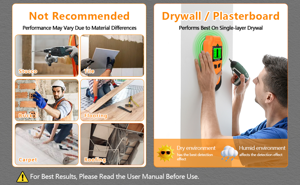 - Thoughtful Choice with Complete Accessories – The stud finder is a practical and considerate tool for DIYers, homeowners, or professionals. The package includes a stud finder, battery and an easy-to-follow user manual—everything they need for their next project! For best results, please read the user manual before use to understand wall types, calibration, and optimal scanning techniques.