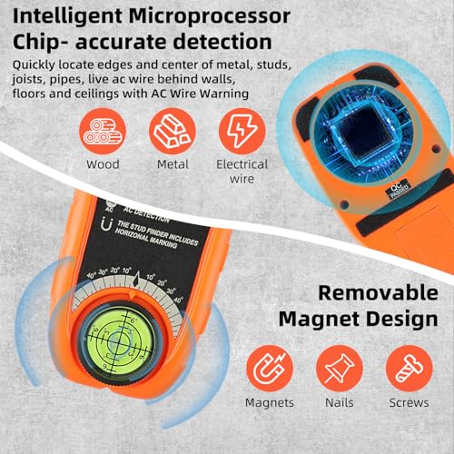 Equipped with intelligent microprocessor chips, The stud finder can accurately and quickly locate edges and center of metal, studs, joists, pipes, live ac wire behind walls, floors and ceilings with AC Wire Warning.