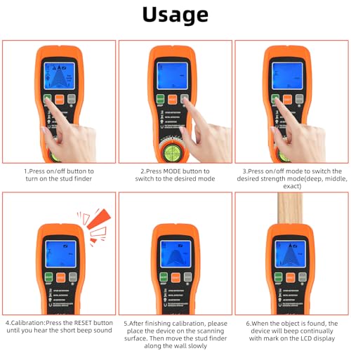 - Easy to use: ①.Place the Stud finder in unobstructed air. ②.Press the on/off button to turn on the stud finder. ③.Press “MODE”button to switch to the desired mode. ④Press the on/off button the switch the desired strength mode(deep, middle, exact). ⑤Calibration: Press the RESET button until you hear a short beep sound. ⑤After finishing calibration, please place the device on the scanning surface. Then move the stud finder along the way slowly. ⑥When the object is found, the device will beep continually with mark on the LCD display.