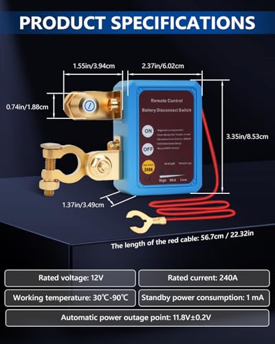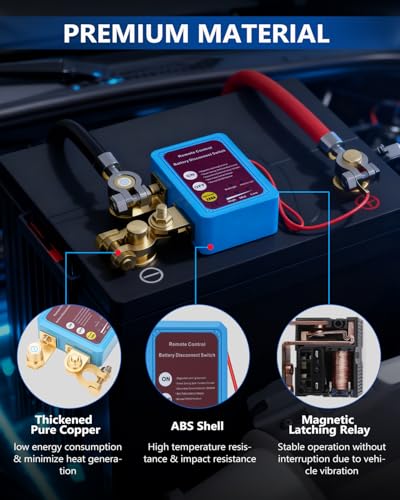 - 【Stable Performance】Constructed from premium ABS material and pure copper components, SUPAREE Wireless Car Battery Disconnect delivers excellent heat resistance, impact strength, and efficient heat dissipation. The internal magnetic latching relay of this Remote Kill Switch remains stable under vehicle vibration and supports instant currents up to 250A. In standby mode, power consumption is only 1mA, so it won’t drain your battery.