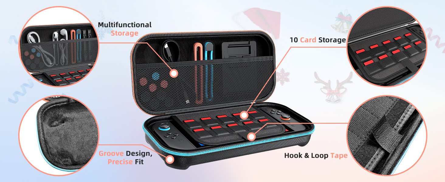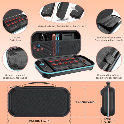 - 【Switch 2 Portable Carrying Case】—This Switch 2 case unites protection and storage, the interior slot snugly fits the back of the console and controller, preventing Switch 2 from shaking. The high-quality EVA hard shell is waterproof and shockproof, while the soft inner material protects against scratches. A mesh pocket provides extra storage for accessories like charging cables, earbuds, and extra controllers. The case can store 10 game cards, and the Game Card Box can hold 24 game cards. For Nintendo 3DS & 2DS Games