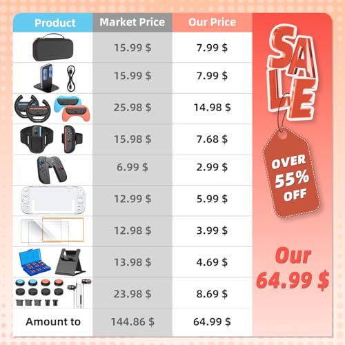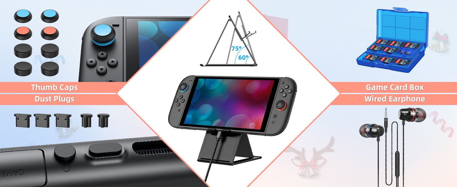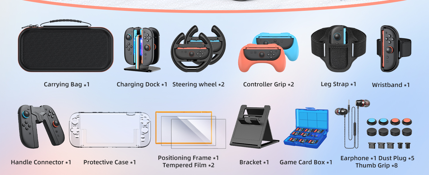 - 【Ultimate Accessories Kit for Nintendo Switch 2】—Worried about buying accessories? We've packed everything into one box!—Carrying Case *1, Controller Charger Dock *1, Grips for Joy Con *2, Steering Wheels for Mario Kart *2, Wrist Band *1, Leg Strap *1, Connecting Grip *1, Console Protective Hard Case *1, PC Grip Protective Cover *2, Tempered Films *2, Playstand *1, Thumb grips *8, Game Card Case *1, Wired Earphones *1, Dust Plugs *5. One-time unlock for a diverse Switch 2 gaming experience.