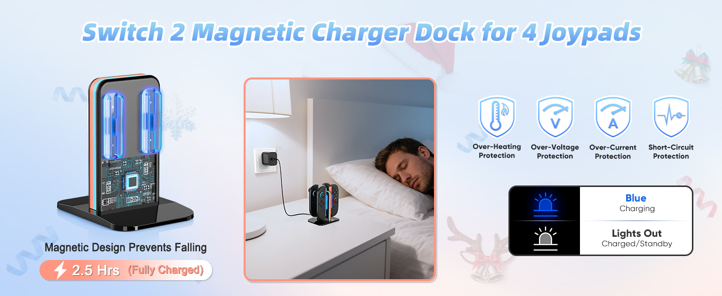 - 【Switch 2 Charging Dock for Joycons】—The charging dock has magnetic function for effortless connect and removal, and can fully charge 4 Joypads at the same time in 3 hours. The blue light indicates charging, light goes off when fully charged or in standby mode. The built-in smart chip provides protection against overcharging, over voltage, over current, and short circuits. A non-slip rubber base keeps the Switch 2 charging dock stable. The controllers can be charged directly with the protective case. For Nintendo 3DS & 2DS Games