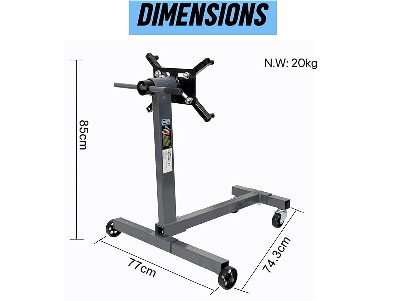 The stand's dimensions of 74.3cm length, 77cm width, and 85cm height make it suitable for most workspace setups. The grey powder-coated finish provides durability and corrosion resistance. Perfect for professional mechanics and automotive enthusiasts, this versatile engine stand combines practicality with reliable performance, making engine maintenance tasks more efficient and manageable.