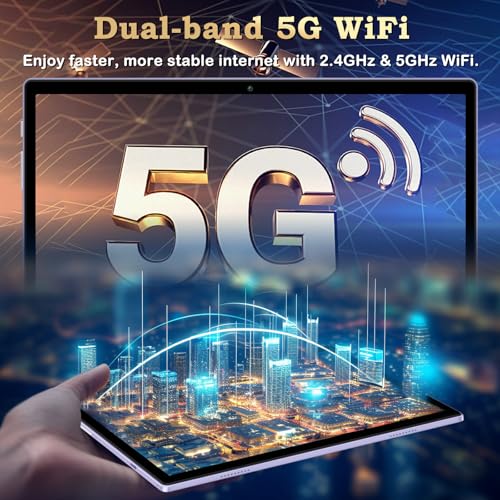 - 【2.4G/5G WiFi+ BT 5.0 + GPS】 10-inch tablet is compatible with dual-band 5.0/2.4G WiFi, providing solid wireless connectivity for faster and more stable transmission, downloads and browsing, especially on congested networks. Thanks to Bluetooth 5.0 technology, you can effortlessly connect your favourite wireless headphones, speakers, keyboard or mouse. Built-in GPS, perfect for navigation.Equipped with a 3.5 mm headphone jack, it is ideal for watching films privately without disturbing others.