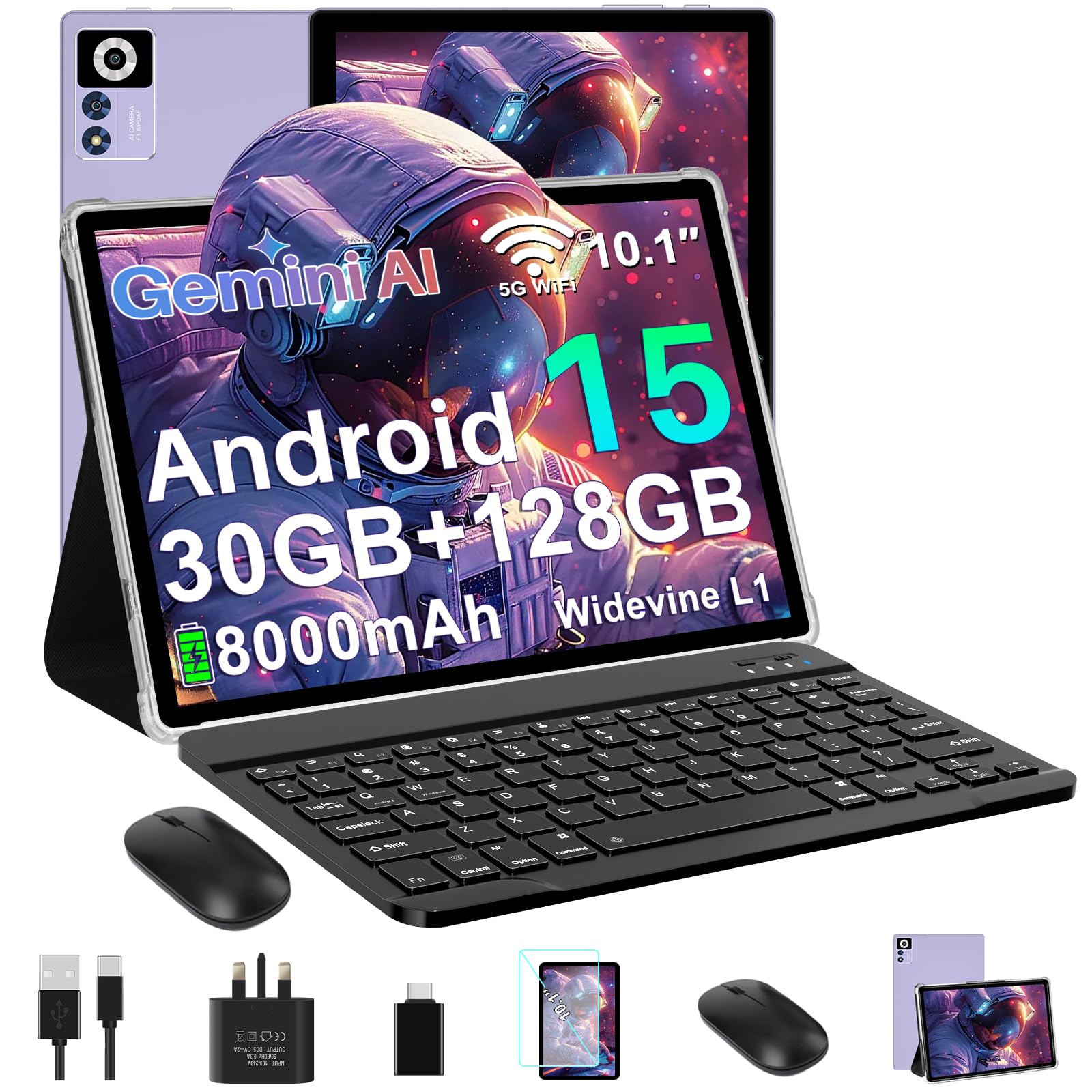Tablet 10 Inch Android 15, 30GB RAM+128GB ROM (TF 2TB), 5G WiFi Tablets,Gemini AI/Widevine L1/8000 mAh/Octa-Core 2.0 GHz/Bluetooth 5.0/GPS/Face ID/2-in-1 Tablet with Mouse and Keyboard – Purple