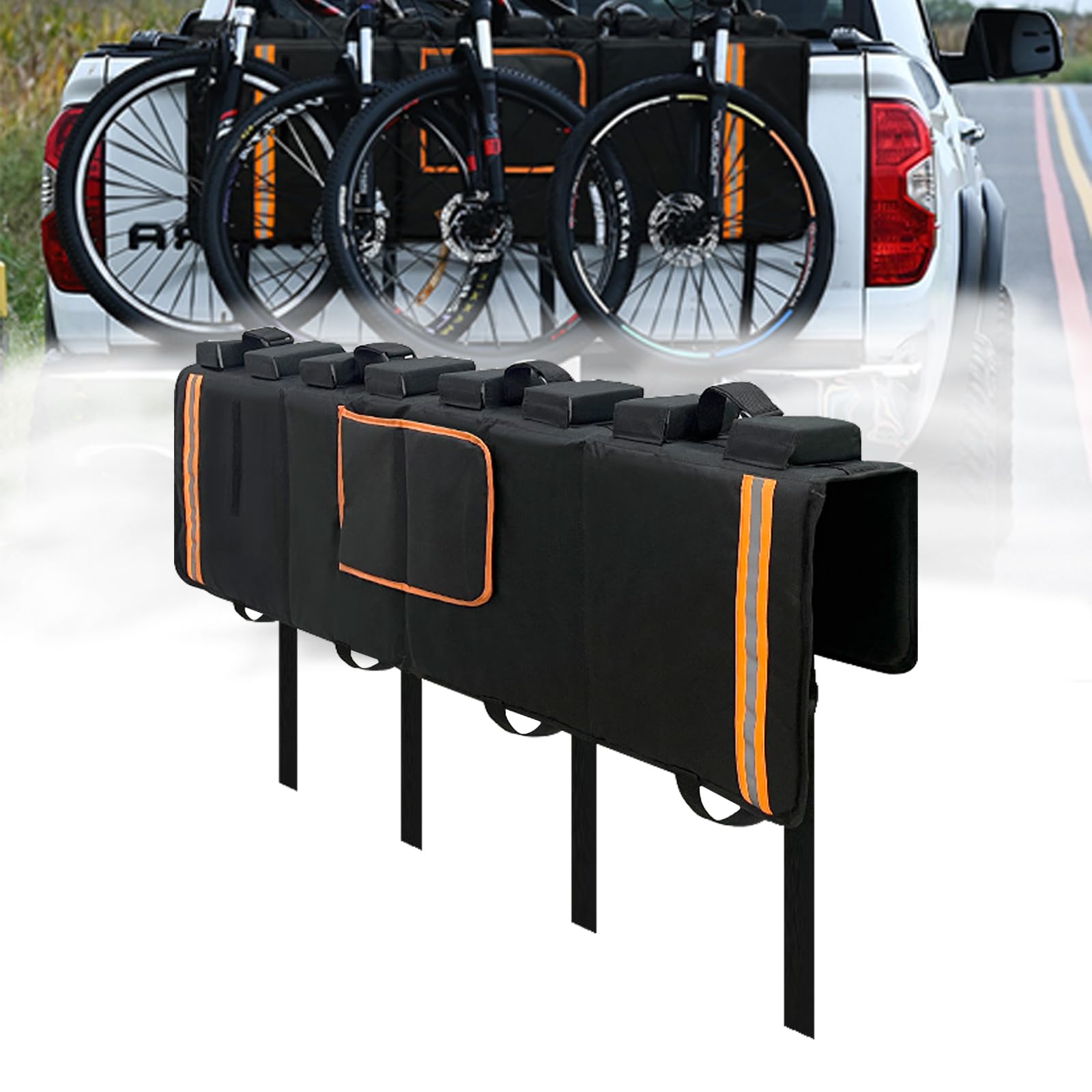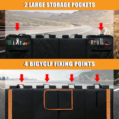 Tailgate Bike Pad for 4 Bicycles, 600D Oxford Waterproof Mountain Bike Tailgate Cover with Reflective Strips, Anti-Sway Straps & 2 Tool Pockets Tailgate Bike Rack 135 x 83 cm