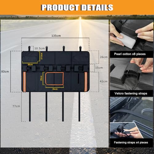 - Practical Design: The mountain bike tailgate pads features a large 35 x 25 cm opening at the centre, allowing easy access to the tailgate handle and rear-view camera. Two internal tool pockets with dual zip and Velcro closures securely store essential repair tools. Two high-visibility reflective strips enhance safety during transit.