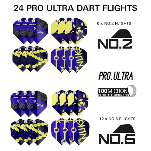 - PRO ULTRA DART FLIGHTS: The Pro Ultra dart flights are crafted from 100-micron and overlaid with a spot UV print to enhance the aesthetic and improve overall durability. Choose from two flight shapes; No.2 and No.6, and six designs included in the set.