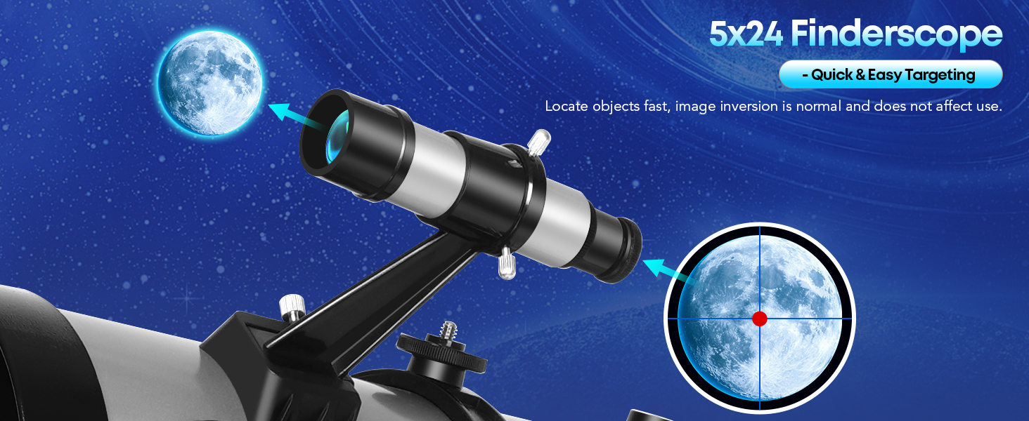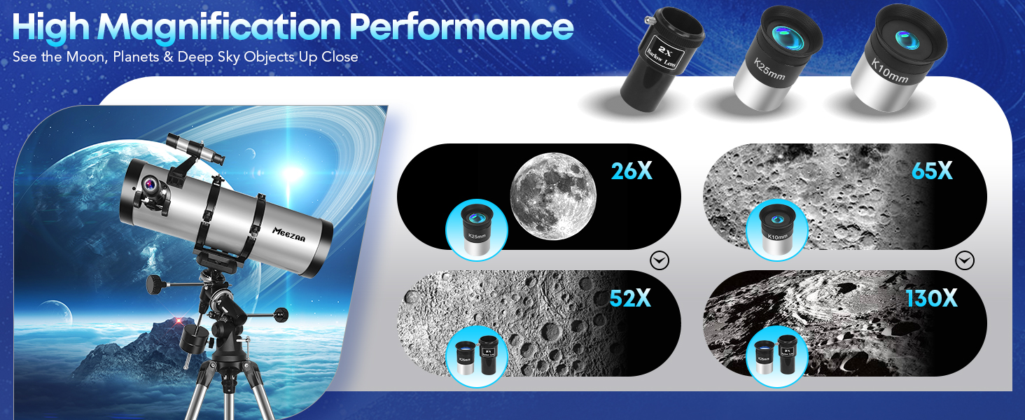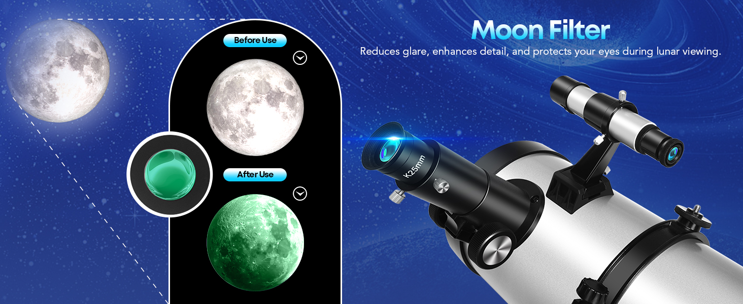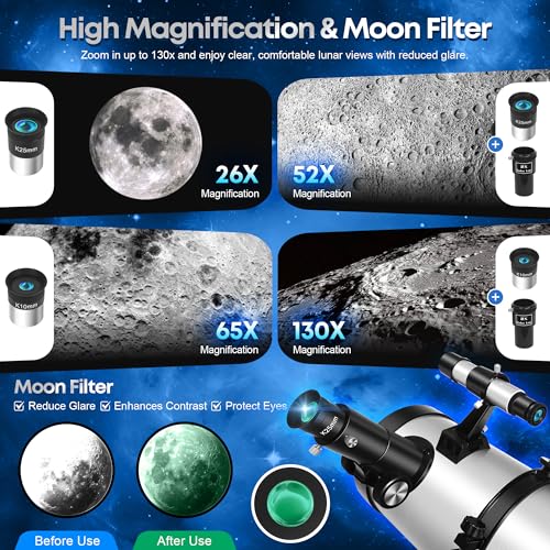 High Magnification & Clear Optics: Includes two premium eyepieces (25 mm & 10 mm) and a 2× Barlow lens for magnification up to 130×. The 5×24 finder scope helps locate targets quickly, and the moon filter reduces glare for comfortable lunar viewing. Ideal for those who enjoy detailed Moon observation or want to get closer views of planets