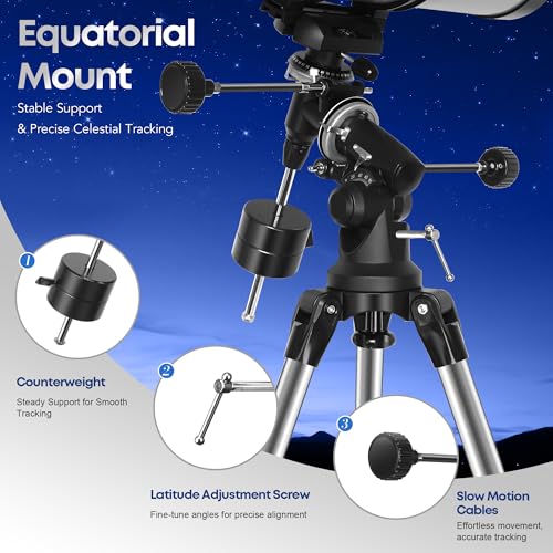 Stable German Equatorial Mount: Equipped with a precision Equatorial Mount and slow-motion control knobs for smooth tracking of celestial objects as they move across the night sky. Ideal for learning manual astronomy tracking and enjoying immersive stargazing sessions