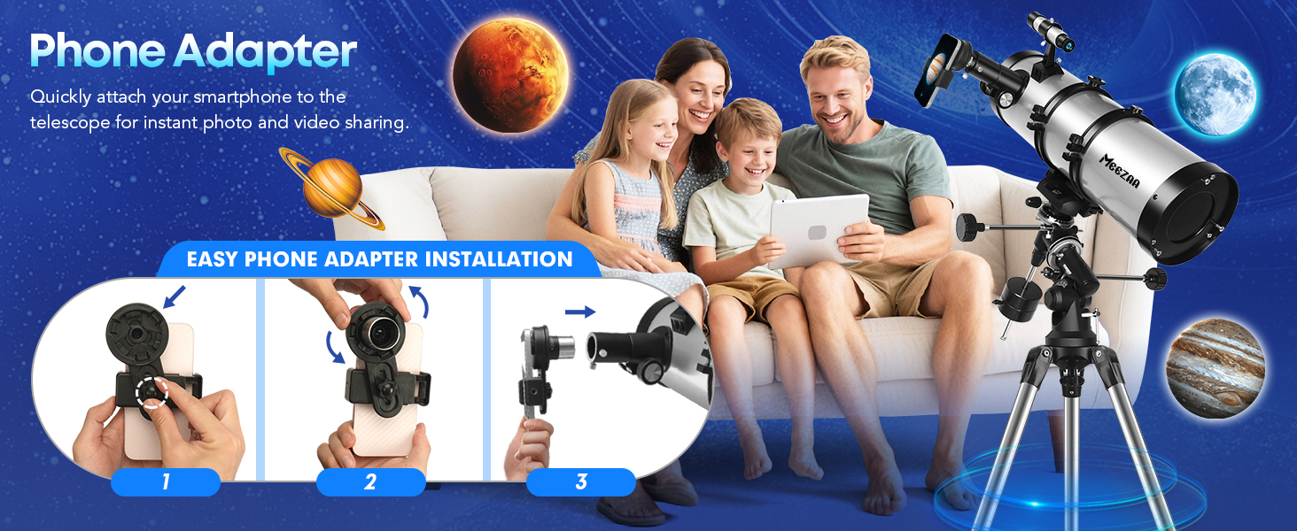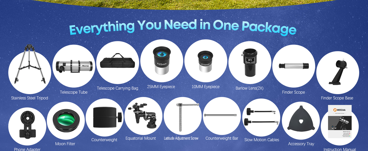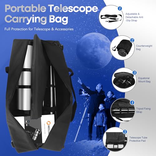 Complete Astronomy Kit for Beginners: Includes a telescope tube, Equatorial Mount, tripod, eyepieces, Barlow lens, phone adapter, finderscope, moon filter, and carry bag, everything needed for family astronomy and stargazing. MEEZAA provides a full starter set, making it ideal for beginners and families to enjoy exciting night-sky adventures together