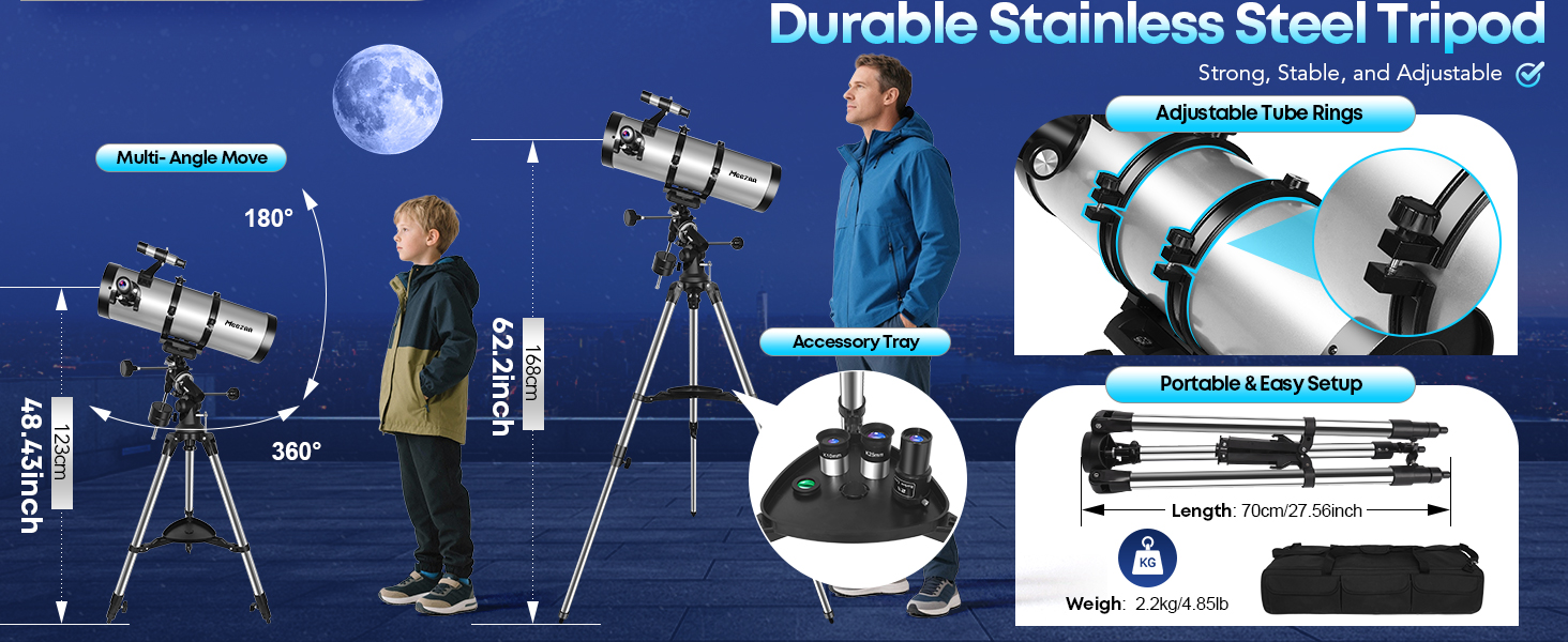 Durable Tripod & Carry Bag: A heavy-duty, height-adjustable stainless-steel tripod ensures stability for steady observation. The included padded carry bag keeps your telescope and accessories organised and protected, easy to store or take outdoors. Great for families, travelers, or hobbyists who love taking their telescope outdoors for backyard or camping-site stargazing