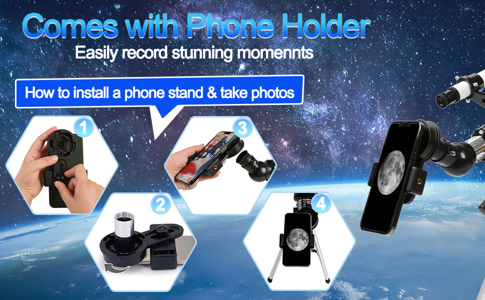 【PHONE HOLDER INCLUDED】 The travel telescope is equipped with a phone adapter that allows you to connect your phone to the telescope to help record wonderful moon observation photos. Share your astronomical discoveries with friends and family with just a click.