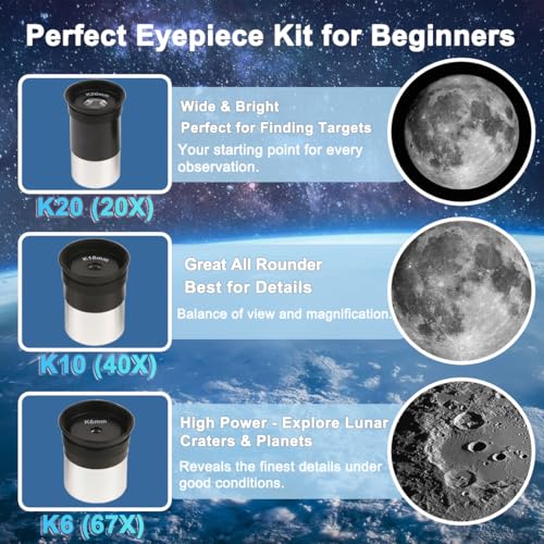 【POWERFUL EYEPIECES & OPTIMUM MAGNIFICATION】 Unlike other models, our telescope for astronomy comes with 3 eyepieces (K20m K10mm and K6mm)to achieve different magnifications. Choose from 20X, 40X and 67X magnifications to observe the moon, planets, and even deep space. The 5×24 finder scope with cross hair line makes locating targets easily.