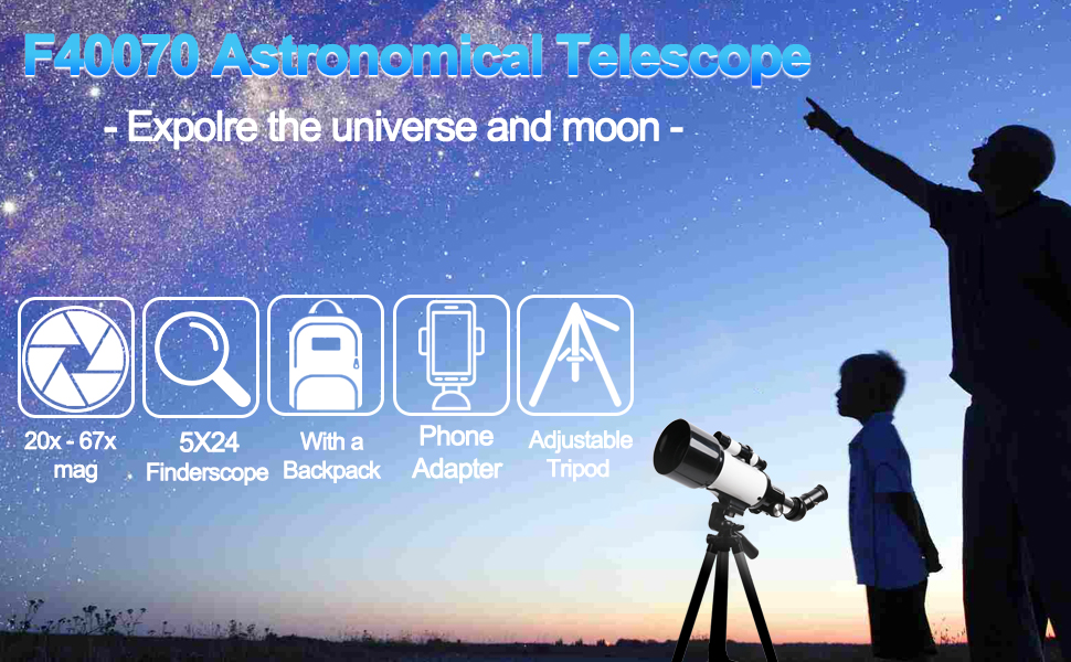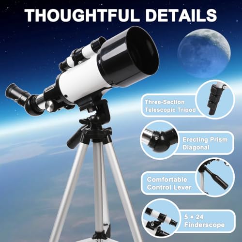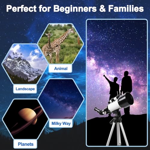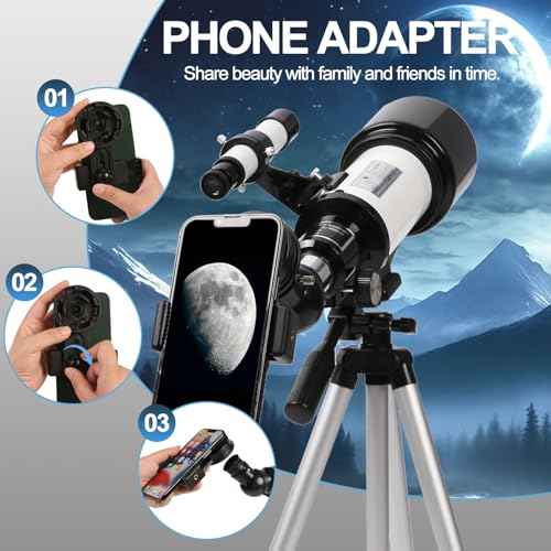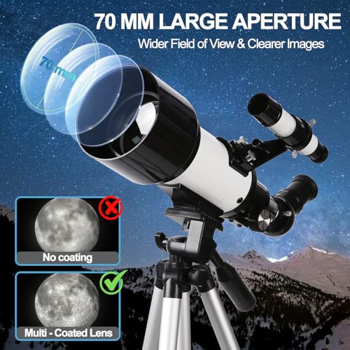 【GREAT TELESCOPE FOR KIDS & BEGINNERS】 With 400 mm focal length and 70 mm aperture to capture more light picture and optical glass optics with high transmittance, creating crisp and sharp images. Perfect telescope for kids and astronomy beginners to explore the Moon and other planets.