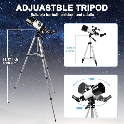 【DURABLE AND ADJUSTABLE TRIPOD】The telescope for beginners allows different viewing positions with its adjustable aluminum alloy tripod, it provides adults and children with an excellent stable observation experience with an adjustable height from 43cm(1.41ft) to 100cm(3.28ft), and the telescope can be adjusted 180 degrees vertically and 360 degrees horizontally.