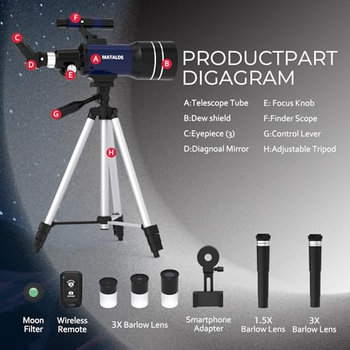 【Complete All-in-One Kit】- Everything You Need to Start,We include every accessory a beginner astronomer requires: finderscope for easy targeting, moon filter to reduce glare, carrying bag for travel, and multiple eyepieces for versatile viewing. The MATALDE telescope is the ultimate educational gift for kids, teens, and adults eager to explore the wonders of space.