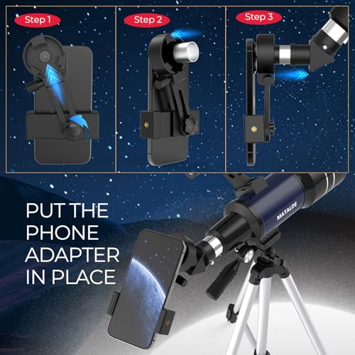 【Astrophotography Made Easy】- Capture & Share Your Discoveries,Turn your smartphone into a cosmic camera! The included smartphone adapter and wireless remote allow you to easily attach your phone to the eyepiece and take stunning pictures and videos of the moon and planets. Share your astronomical discoveries with friends and family with just a click.