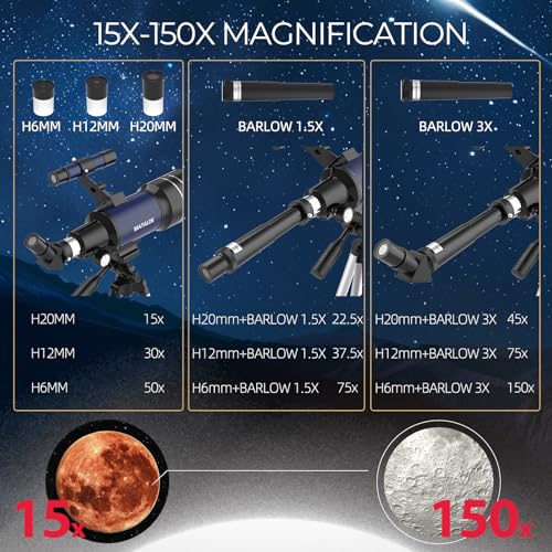 【Powerful 15X-150X Magnification】- Explore The Cosmos In Detail, Customize your view with 3 replaceable eyepieces (H20mm, H12mm, H6mm) and a 3X Barlow lens. This versatile combination offers a magnification range from 15X to 150X, allowing you to widen your perspective for star gazing or zoom in for a close-up on planetary details, catering to all your observational needs.