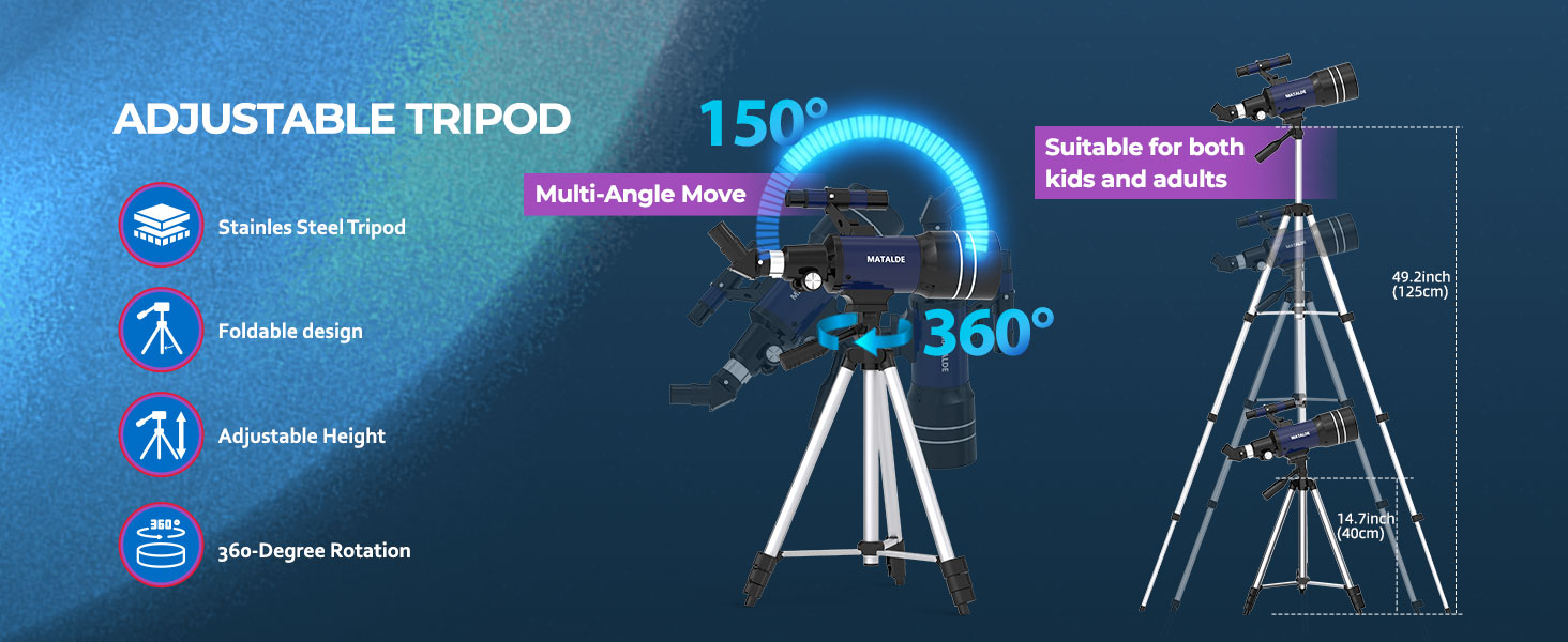 【Quick Setup & Stable Observation】- Ready for Adventure in Minutes,Get started in no time! The included adjustable aluminum alloy tripod provides a rock-solid foundation, eliminating shaky views. The 45° diagonal prism ensures comfortable viewing whether you're seated or standing, making long-lasting observation sessions of the night sky relaxed and enjoyable for the whole family.
