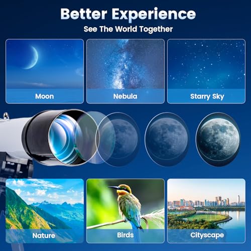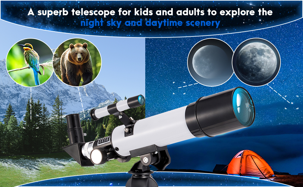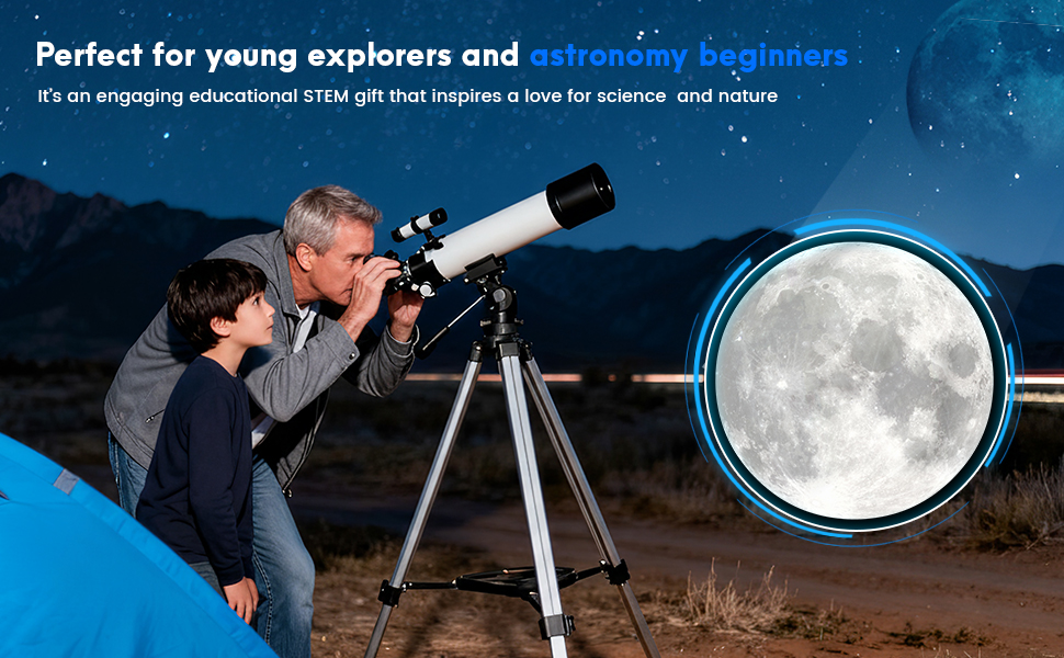 【Portable with Tripod 】Take your portable travel telescope anywhere! The included aluminum alloy tripod offers steady observation, during travel, camping, or school activities. Its compact, lightweight frame ensures easy setup and storage, making it a perfect kids telescope for 8-12 year olds and beginners.
