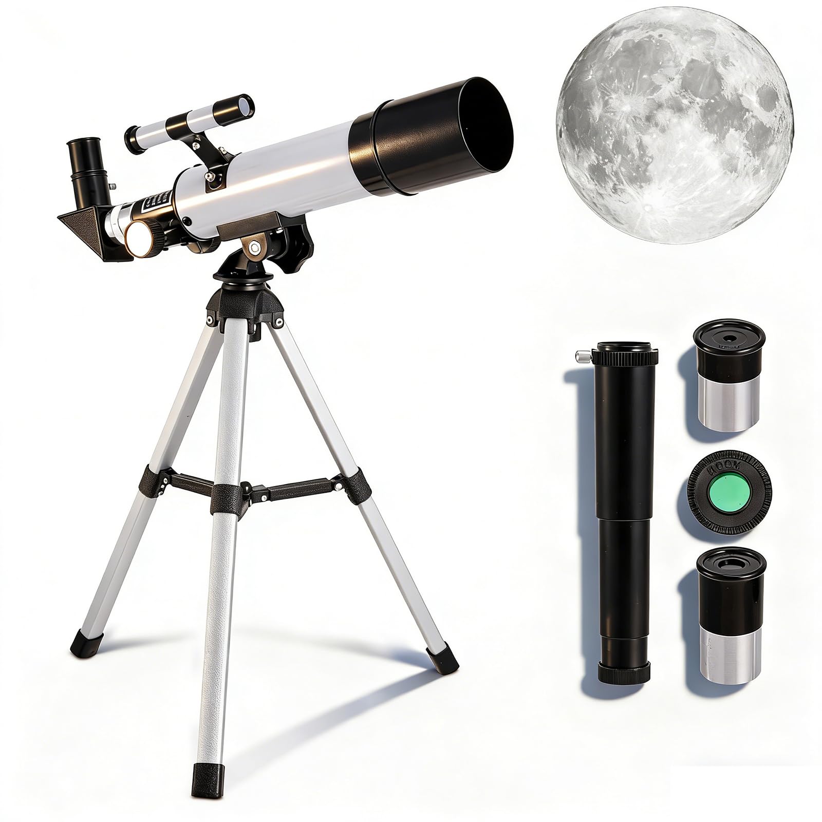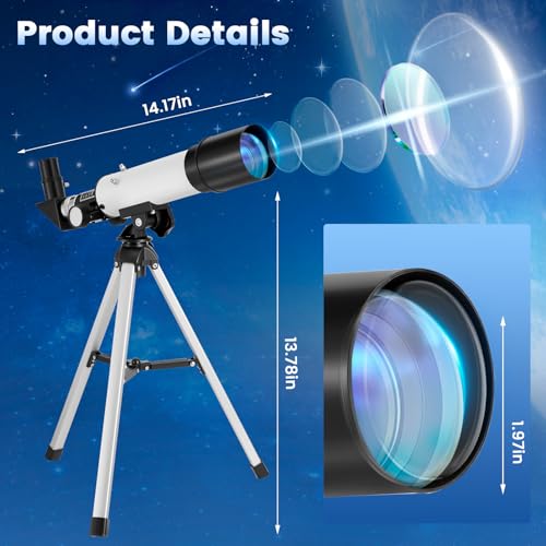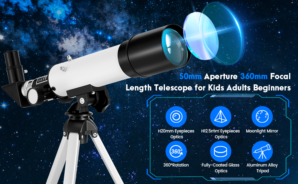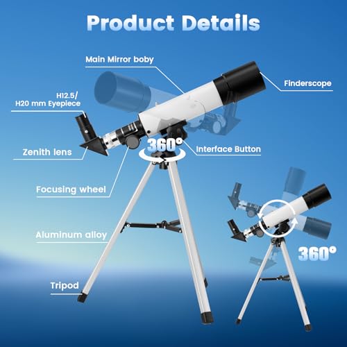 【 Beginner Telescope for Kids & Adults 】Start your celestial journey with this user-friendly refractor telescope! Featuring a 50mm aperture and 360mm focal length, it delivers bright, detailed views of the moon, planets, and terrestrial targets like birds and landscapes. Perfect for young explorers and astronomy beginners, it’s an engaging educational STEM gift that inspires a love for science and nature.