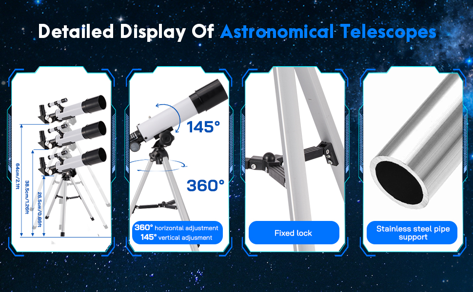 【Easy Tool& Adjustable Viewing Angles】No tools required for quick installation! This professional refractor telescope can be adjusted 180° vertically and 360° horizontally, allowing flexible positioning for comfortable observation. With a straightforward manual, kids and beginners can easily learn to operate and focus, promoting hands-on learning and independent exploration.