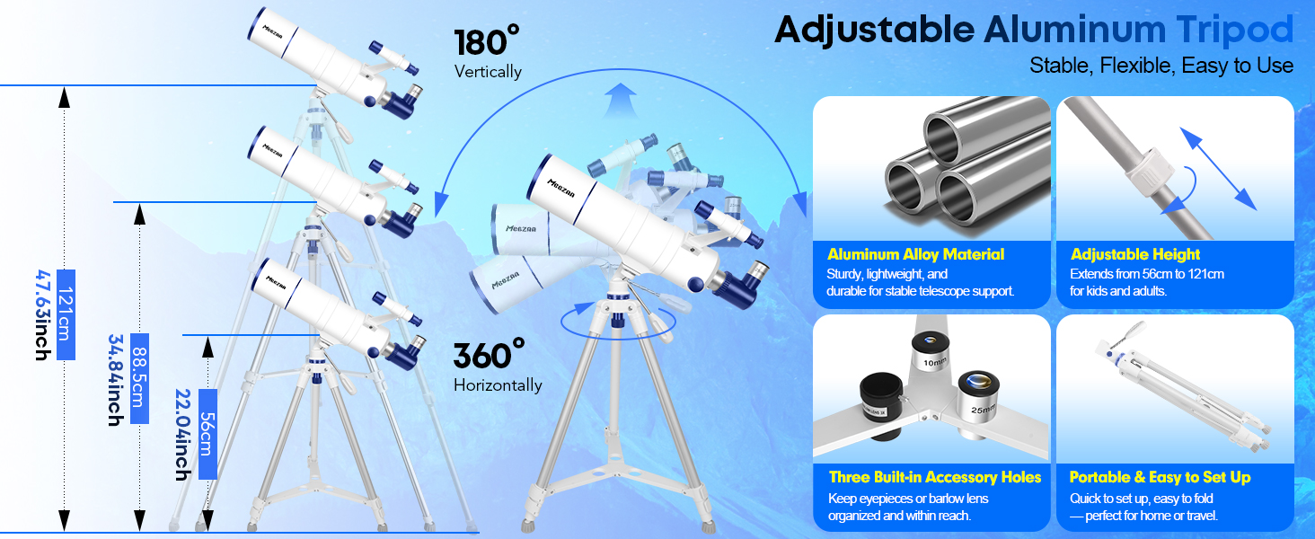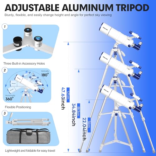 Portable & Convenient – Designed for Home, Travel & Camping: Includes a sturdy, height-adjustable tripod (56–121 cm) and a carry bag for easy storage and travel. With three built-in accessory holders for quick access to eyepieces, this telescope is perfect for daytime viewing of birds and landscapes, and night-time stargazing from your garden, countryside spots or outdoor holidays