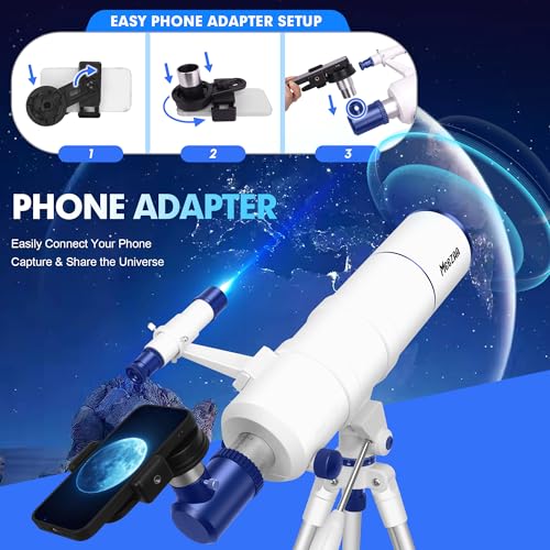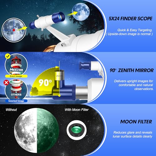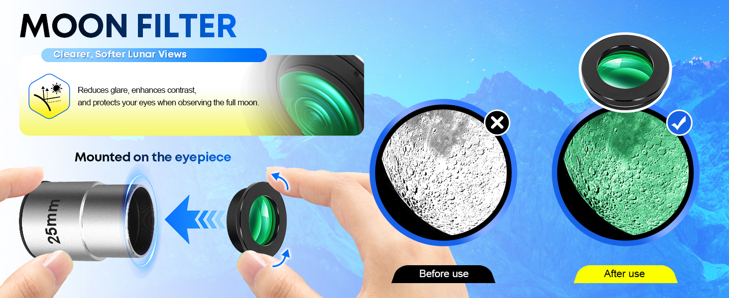 Quick Setup & Family-Friendly Accessories: No tools required – assemble in minutes using the clear instructions. Includes: Moon filter to improve contrast on bright lunar views; Phone adapter for taking photos and videos through the eyepiece; 90° diagonal for comfortable upright viewing. Perfect for backyard star parties, and recording your family’s discoveries of the Moon and planets